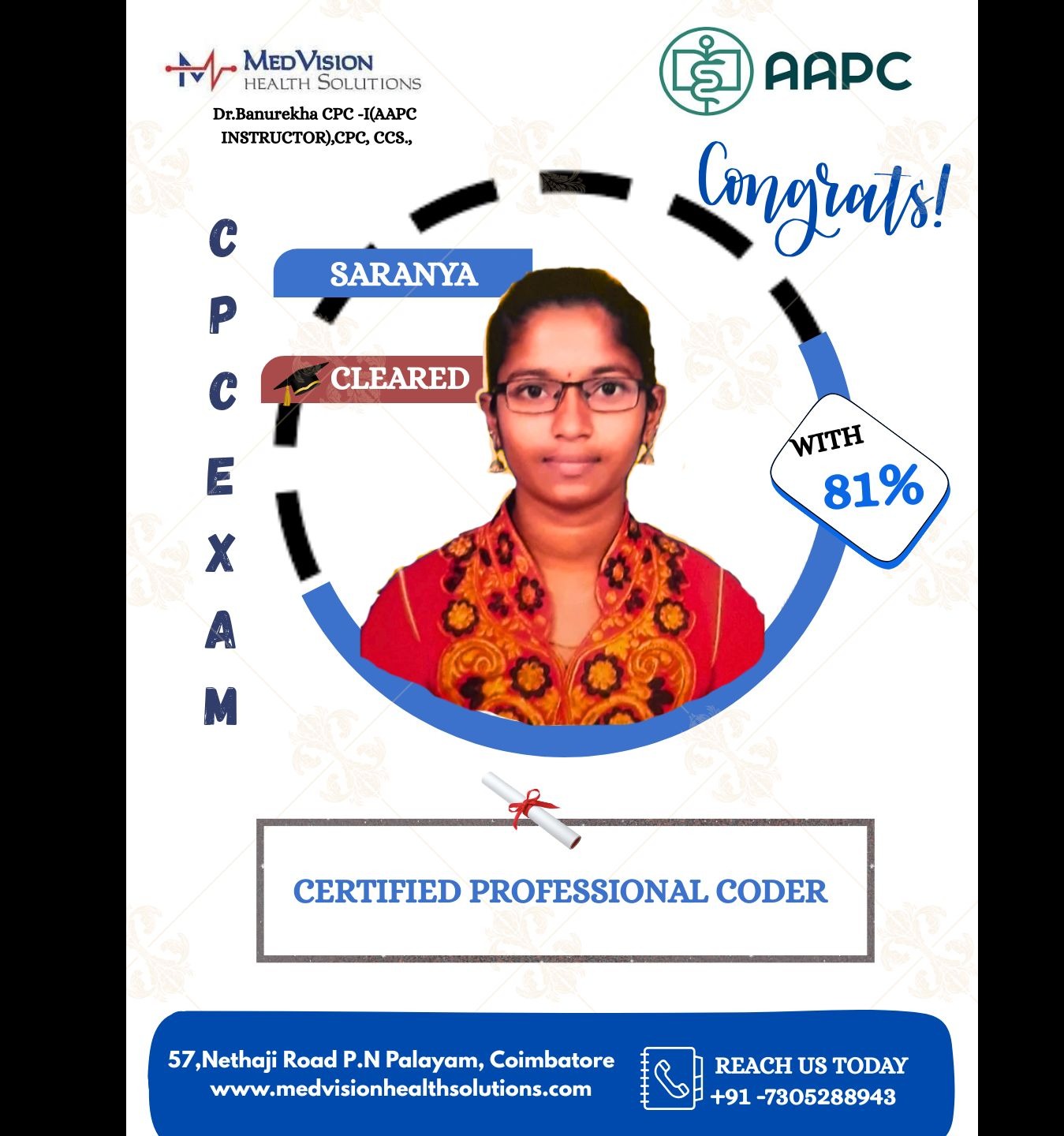 CONGRATULATIONS SARANYA!! At MedVision Health Solutions, we believe it’s not where you train, but where you gain perfect knowledge that matters! With 25+ years of excellence, under the leadership of Dr. Banu Rekha (CPC, CPC-I, CCS), we are proud to be pioneers in medical coding training. Our custom-designed courses, expert faculty, and passion for perfection have helped over 10, 000 students — doctors, professors, and graduates — build successful careers in specialty coding (ED, E& M, Surgery, Radiology, Anesthesia, and more). We have strong placement records and collaborations with top colleges like SNMV, PSG CAS, and Vellalar College. Dreaming of a career in medical coding? Train with us and secure your future! MedVision – Teaching with Passion to Attain Perfection. Keywords : Medical Coding Training, Best Medical Coding Academy Coimbatore, Medical Coding Certification, CPC Certification Training, Medical Coding Placement, Specialty Medical Coding, Best Medical Coding Institute Coimbatore, Medical Coding Courses, Career in Medical Coding, MedVision Health Solutions, Medical Coding Course, Medical Coder Classes, Medical Coding Coaching #medicalcodingtraining #medicalcodinglife #medicalcodingjobs #careerinhealthcare #healthcarecareers #medicalcodingindia #medicalcareer #medicalcodingfuture #medicalcoding #cpcexamprep #cpctraining #healthcareindustry #medicaleducation #graduates #collegestudents #fresKAhershiring #jobseeker #careergrowth #coimbatorejobs #coimbatorecareer #studyincoimbatore #skilldevelopment #professionaltraining #certifiedmedicalcoder #futureready #perfectmedicalcoder #learnandearn #studentsuccess #trainwithexperts #gethireddc